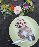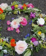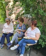 16 Interessentinnen waren gekommen und gruppierten sich um den Blütenkranz, den Ana auf dem Boden arrangiert hatte. Die Blütenlimonade erfrischte uns alle an diesem heißen Tag . Ana richtete, während alle das kühle Getränk genossen, schon die Holunder-Blinis mit der Rhabarber-Creme an. Ich erzählte während dessen von der Bedeutung des Holunder-Strauchs für unsere Vorfahren, nicht nur als Lieferant für Nahrung und Heilmittel, sondern als Wohnstatt für die Seelen der Ahnen, der Elementar- und Hofgeister, sowie die Bedeutung von „Frau Holle“ als wichtige Gottheit im keltisch-germanischen Raum (Literaturhinweis: Wolf-Dieter Storl, Pflanzen der Kelten, AT Verlag).